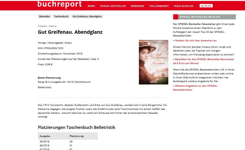 Viele warten auf die Fortseztung der Gut-Greifenau-Reihe. Das Taschenbuch hat sich bei Thalia schon den Platz #1 der vorbestellten historischen Romane gesichert.